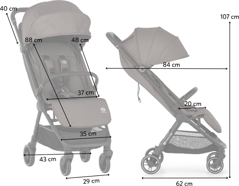 - Rozmery zloženého kočíka: 55 cm (dĺžka) × 43 cm (šírka) × 24 cm (výška)