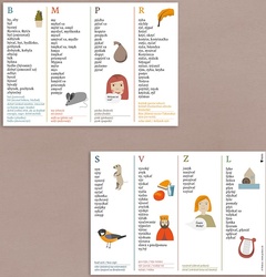 Vybrané slová pre deti na obojstrannom kartónovom papieri - súhrnná karta s najčastejšími chytákmi, vybrané slová po B, M, P, R, S, V, Z a L.