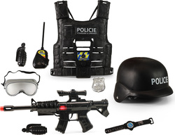 Tento profi set obsahuje samopal, ochrannú vestu, granát, vysielačku, hodinky, odznak, okuliare a helmu. Všetko je vyrobené z plastu. Zaži skutočnú zásahovú akciu!