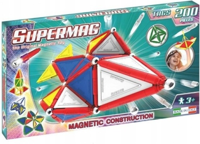 Magnetická stavebnica Supermag Tags Primary 200 obsahuje 200 dielikov, ktoré umožňujú vytvárať priestorné modely pomocou magnetických tyčiniek a spojov. Hra rozvíja kreativitu, priestorové vnímanie a jemnú motoriku.
