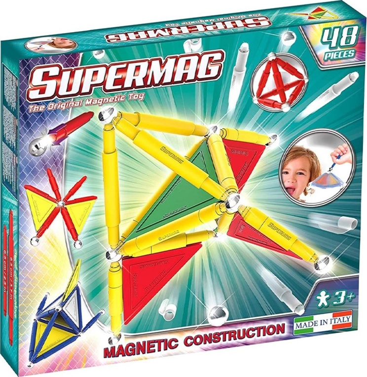 Stavebná magnetická súprava Supermag Tags Magnetic Construction 48 kusov umožňuje deťom tvoriť 3D postavy a konštrukcie pomocou geometrických tvarov spájaných magnetmi. Prispieva k rozvoju jemnej motoriky, kreativity a priestorového vnímania.