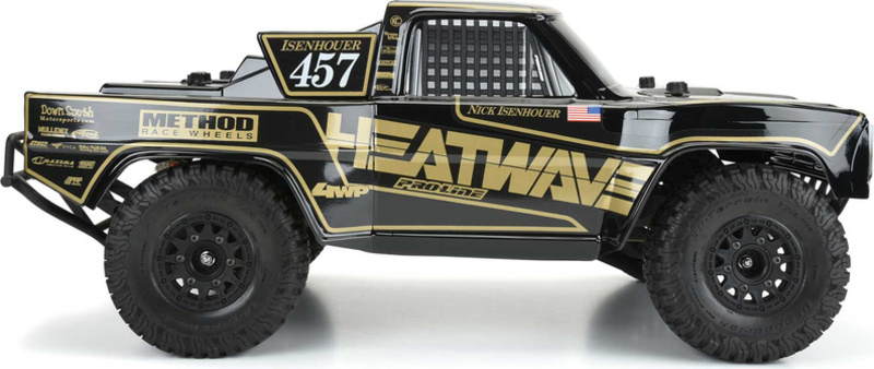 černá karoserie Ford® F-100 Race Truck Heatwave® v edici z roku 1967 pro Short Course. Nyní si můžete postavit plně licencovanou repliku oblíbeného plnohodnotného Heatwave® Trophy Truck řízeného Chrisem Isenhouerem! Chris závodí na svém ikonickém Black and Gold Heatwave® Ford® F-100 převedeném na specifikace Trophy Truck v neúprosné poušti spolu se svým bratrem Nickem. Pro-Line je hrdý na to, že může oživit Chrisův náklaďák pro váš Short Course, který je vyroben z odolného černého polykarbonátu! Black and Gold Heatwave® obtiskový obal je součástí balení a předem nařezaný pro snadnou instalaci.