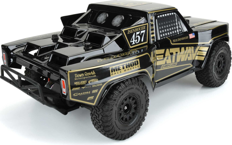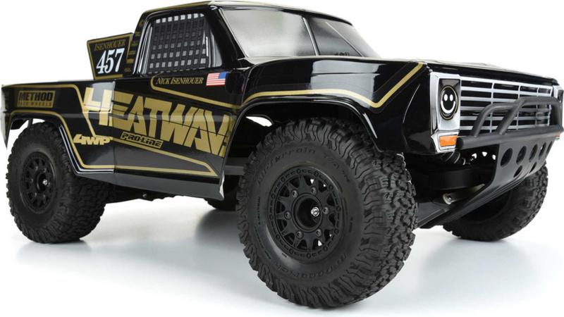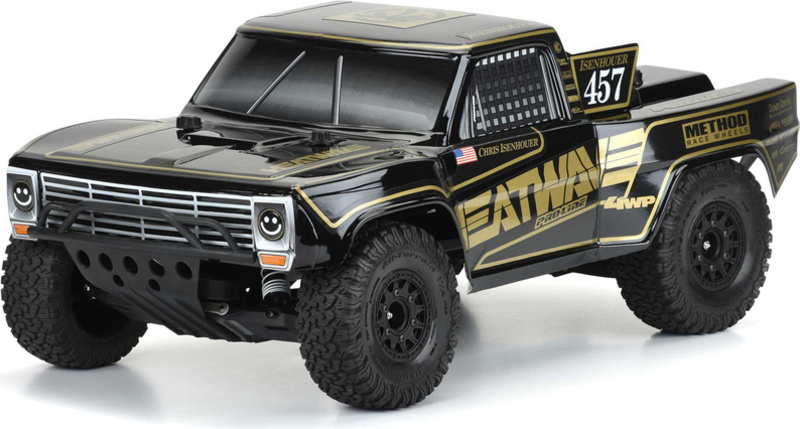 Karoserie se vyznačuje ikonickou plochou přední mřížkou F-100 a širokými lemy blatníků, které reprezentují agresivní sklolaminátové vybouleniny, které se nacházejí na Chrisově závodním stroji. Materiál Pre-Cut Tough-Color Black se nikdy neodlupuje ani neodlupuje a součástí jsou také realistické samolepky na okna! Vše co musíte udělat abyste mohli začít pracovat: odstraňte vnější fólii, umístěte podle přiložených pokynů a nalepte na karosérii. Změňte vzhled svého modelu Short Course a přidejte ještě větší realističnost s plně licencovanou karoserií Ford® F-100 Race Truck Heatwave® Edition z roku 1967 od Pro-Line!