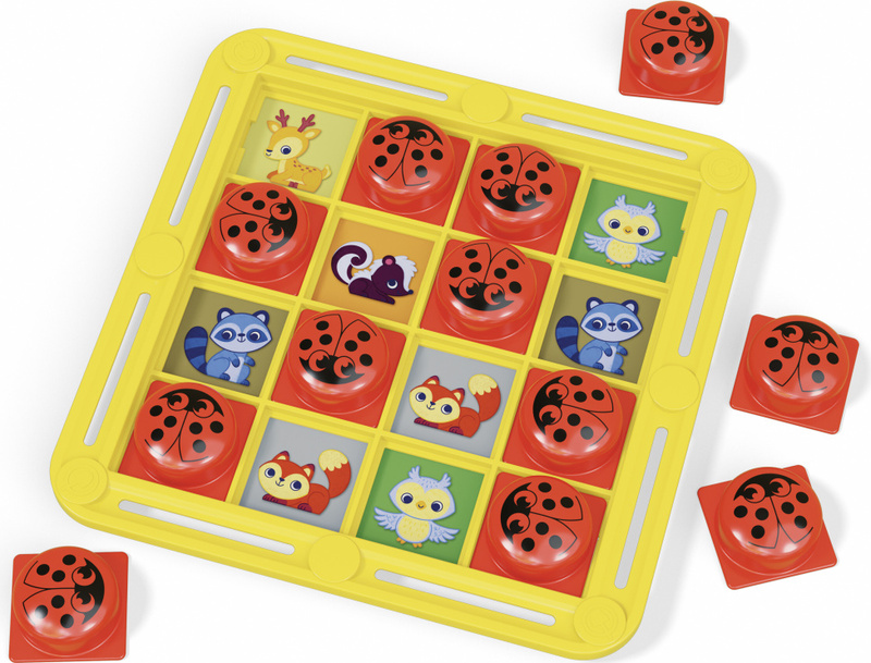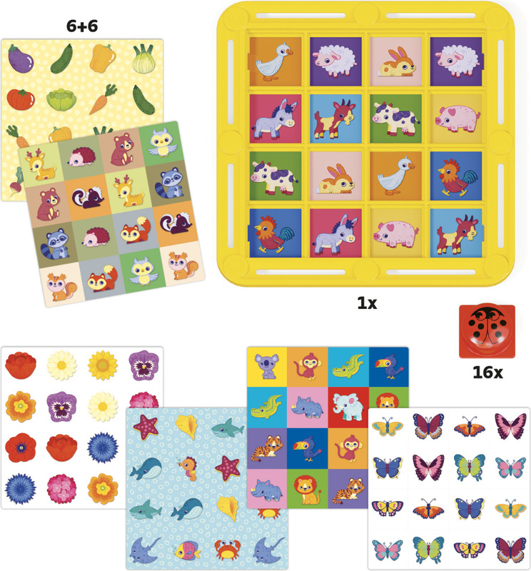- 1 žltá mriežka, 16 červených krycích žetónov s motívom lienky, 6 obojstranných ilustrovaných kariet.