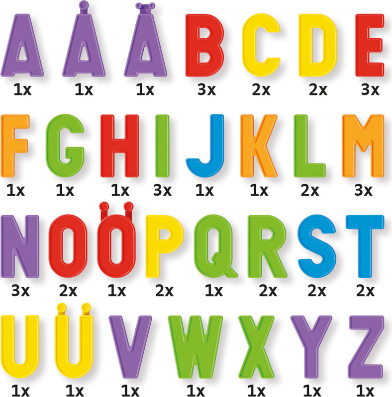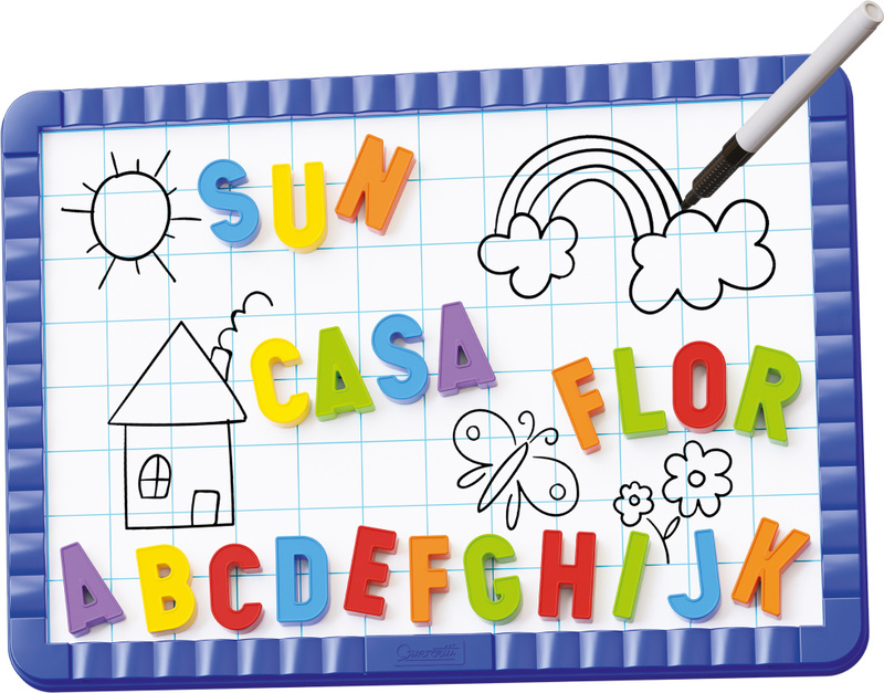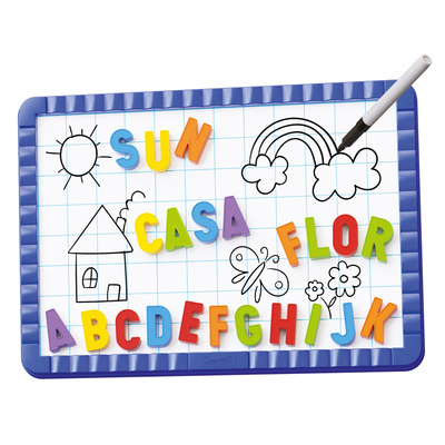 Zábavná pomôcka pre hravé učenie abecedy a tvorenie prvých slov pre deti od 4 rokov. Magnetická tabuľa s pevným, nárazuvzdorným rámom. Deti si na tabuli najskôr skladajú magnetické písmená a učia sa poznávať abecedu. Neskôr, až sa naučia jednotlivé písmená si môžu deti tvoriť prvé slová. Zároveň si na tabuľu môžu medzi magnetkami kresliť priloženou stierateľnou fixkou. Hravý spôsob, ako podporiť jemnú motoriku aj prvé čitateľské zručnosti.