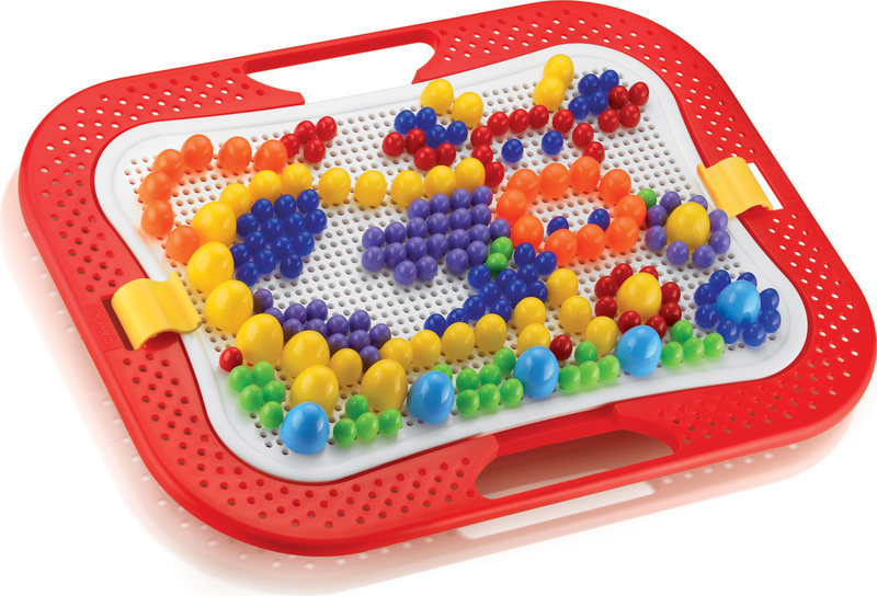 Kreatívna mozaiková hra určená deťom od 3 rokov. Perforovaná plastová doska je vsadená v ráme s oblými hranami a opierkou, takže ju možno postaviť horizontálne aj vertikálne. Vďaka zabudovaným rukovätiam je hra ideálna aj na prenášanie. Deti vkladajú plastové farebné štipce do otvorov v doske a vytvárajú obrázky podľa šablóny z priloženého albumu, alebo si mozaiku tvoria podľa vlastnej fantázie.
