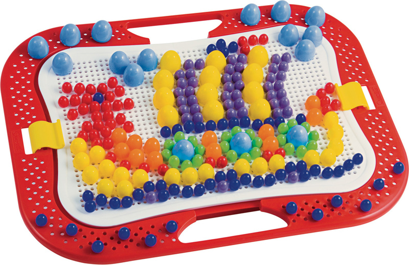 Kreatívna mozaiková hra určená deťom od 3 rokov. Perforovaná plastová doska je vsadená v ráme s oblými hranami a opierkou, takže ju možno postaviť horizontálne aj vertikálne. Vďaka zabudovaným rukovätiam je ideálny aj na prenášanie. Deti vkladajú plastové farebné štipce do otvorov v doske a vytvárajú obrázky podľa šablóny z priloženého albumu, alebo si mozaiku tvoria podľa vlastnej fantázie.