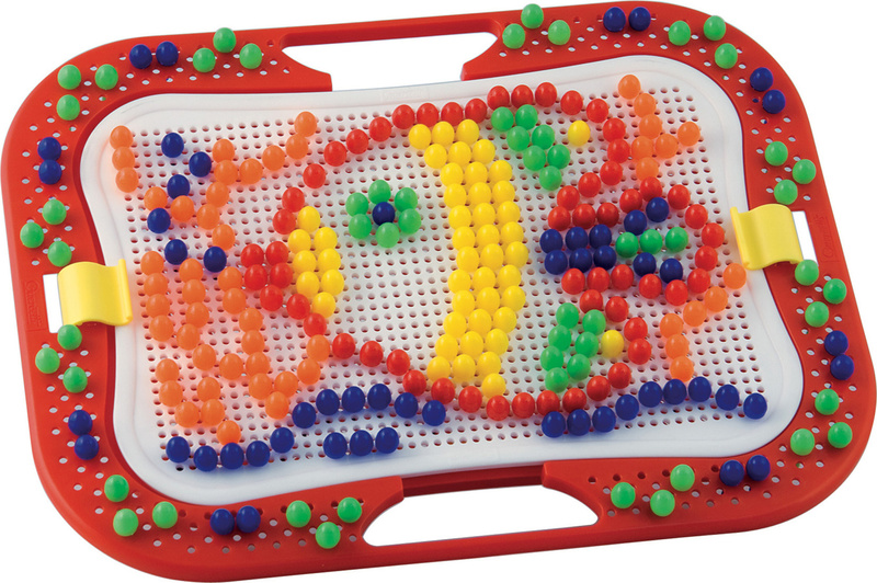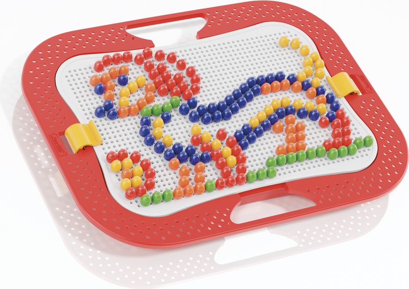Kreatívna mozaiková hra určená deťom od 3 rokov. Perforovaná plastová doska je vsadená v ráme s oblými hranami a opierkou, takže ju možno postaviť horizontálne aj vertikálne. Vďaka zabudovaným rukovätiam je ideálny aj na prenášanie. Deti vkladajú plastové farebné štipce do otvorov v doske a vytvárajú obrázky podľa šablóny z priloženého albumu, alebo si mozaiku tvoria podľa vlastnej fantázie.
