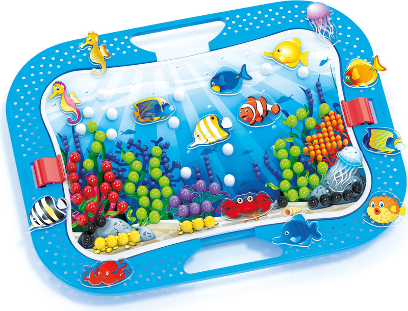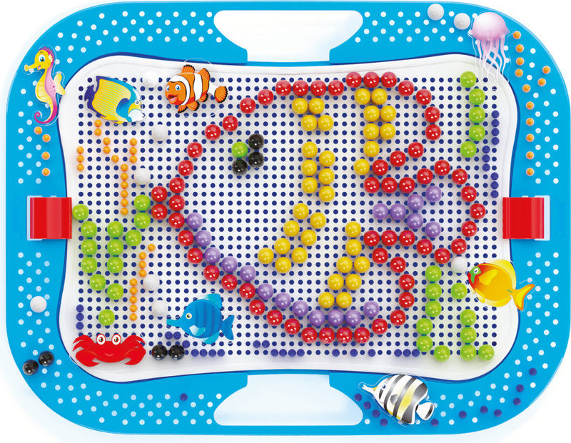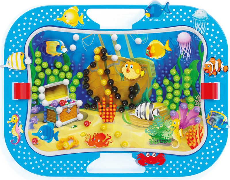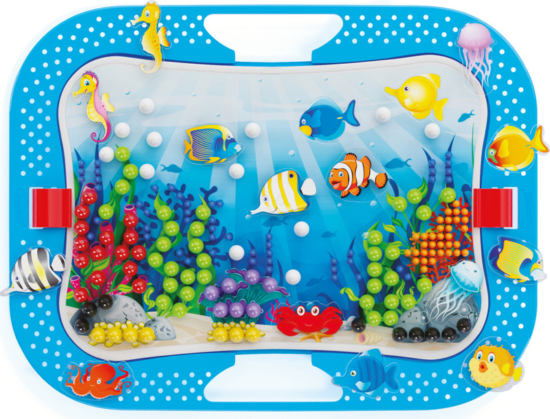 Kreatívna mozaiková hra určená deťom od 3 rokov. Perforovaná plastová doska je vsadená v ráme s oblými hranami. Deti vkladajú plastové farebné štipce do otvorov v doske a vytvárajú obrázky s rybami a ďalšími morskými živočíchmi podľa šablóny z priloženého albumu, alebo si mozaiku tvoria podľa vlastnej fantázie. Vďaka zabudovaným rukovätiam je hra ideálna aj na prenášanie. Po skončení hry je možné všetko uložiť do kufríka, ktorého veko po zaistení poistkou tvorí sama hracia doska.