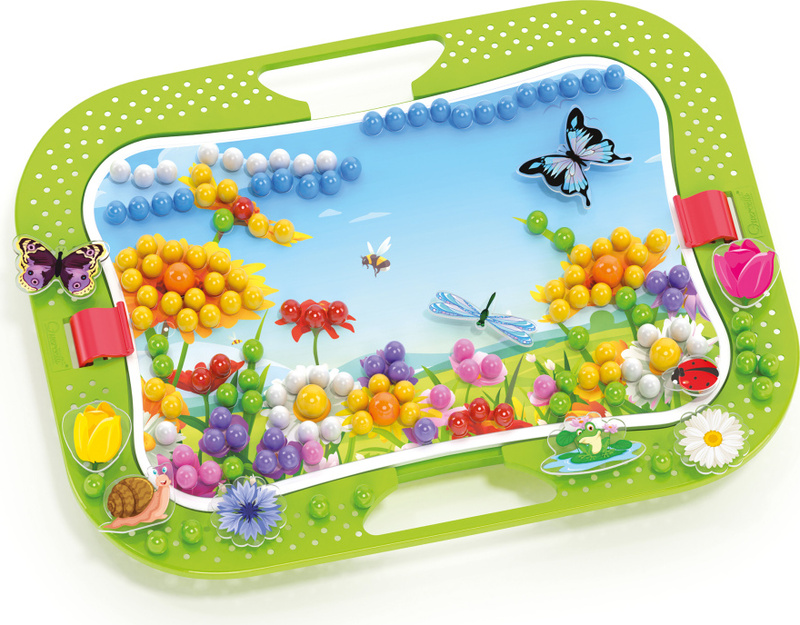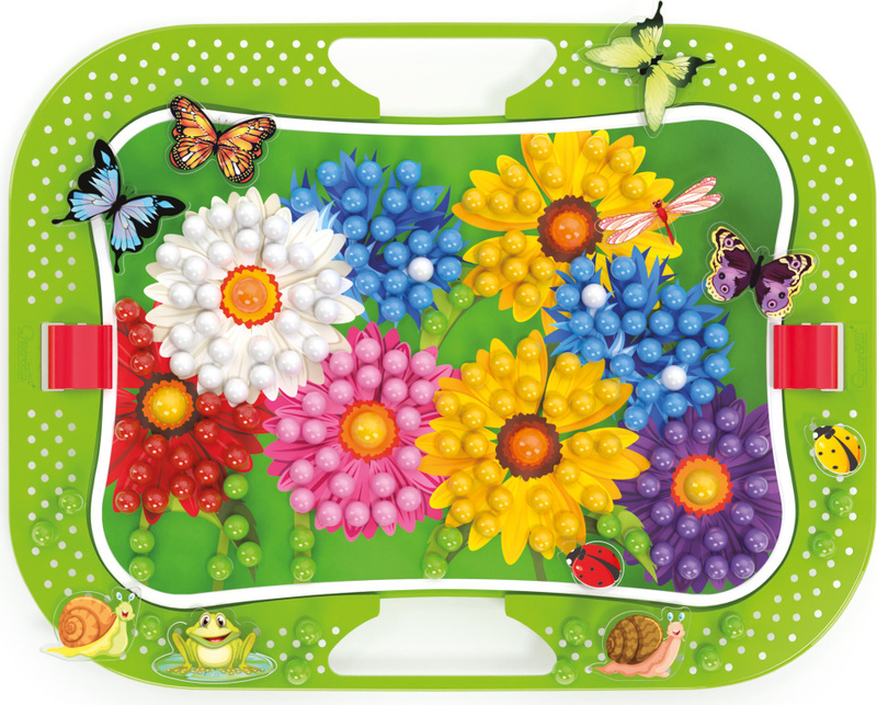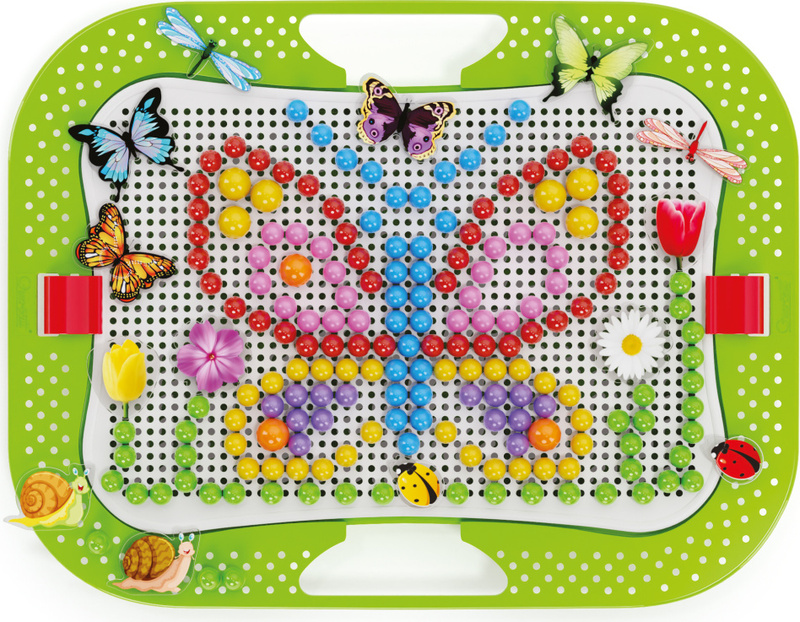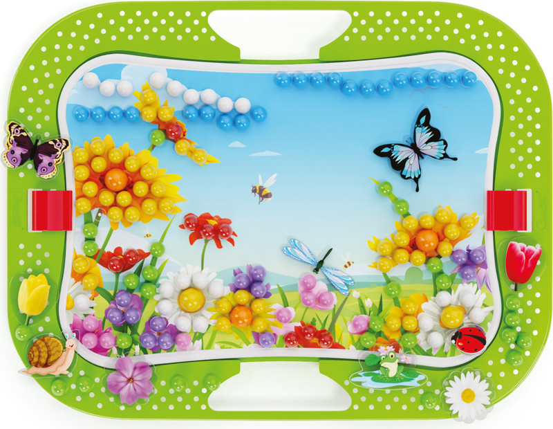 Kreatívna mozaiková hra určená deťom od 3 rokov. Perforovaná plastová doska je vsadená v ráme s oblými hranami. Deti vkladajú plastové farebné štipce do otvorov v doske a vytvárajú obrázky s kvetinami, motýľmi, vážkami a lienkami podľa šablóny z priloženého albumu, alebo si mozaiku tvoria podľa vlastnej fantázie. Vďaka zabudovaným rukovätiam je hra ideálna aj na prenášanie. Po skončení hry je možné všetko uložiť do kufríka, ktorého veko po zaistení poistkou tvorí sama hracia doska.