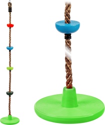 Detské šplhacie lano s farebnými diskami a zakončené okrúhlou hojdačkou z plastu.