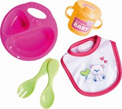 Príslušenstvo pre bábiky obsahuje tanier, lyžičku, vidličku, hrnček a podbradník pre bábiky s veľkosťou 30-43 cm. Celkom 5 ks.