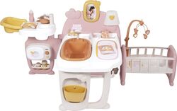 Hracie centrum pre bábiky Baby Nurse s 3 hracími zónami je vybavené transportnými kolieskami, rukoväťou a je skladacia pre ľahkú prepravu. Po otvorení prekvapí tromi priestrannými hracími kútikmi: kuchynkou, kúpeľňou a spálňou. Umývací priestor je vybavený odnímateľnou vaničkou, hneď vedľa je prebaľovací pult, ktorý zároveň slúži ako šatňa.Pod komodou je vešiak na uteráky, háčik na kabát a vyberateľný odpadkový kôš. Rám obrazu na zadnej stene je možné prispôsobiť vlastnými fotografiami. Jedálenský kút so sedadlom pre bábiky má drez s batériou (nefunkčný), varnú dosku, mikrovlnnú rúru a odkladacie police.