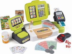 Elektronická pokladňa s funkciou naozajstnej kalkulačky, skener so svetelnou a zvukovou funkciou, čítačka kreditných kariet s účtenkou, mechanická váha, makety potravín, mikrofón a ďalšie.