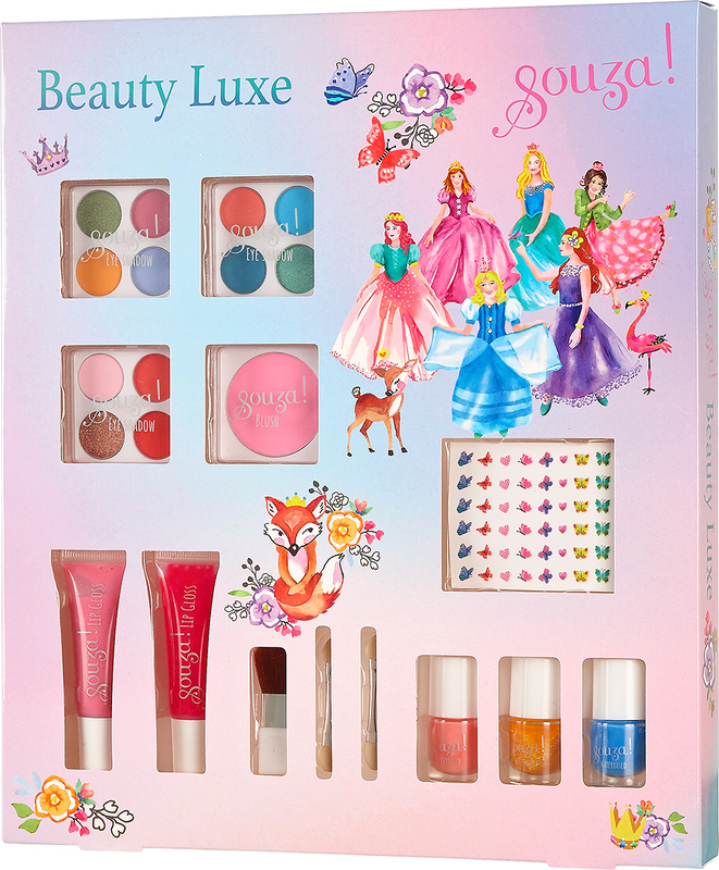 Detská make-up sada Beauty Luxe obsahuje: 12 očných tieňov (v troch paletkách po 4 kusoch), lícenku, 2 lesky na pery, 3 laky na nechty, hárok samolepiek na nechty, štetec a aplikátory.