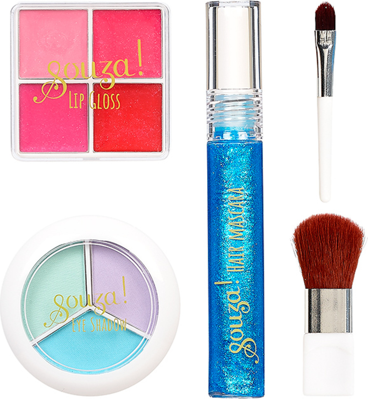 Detská make-up sada pre malé princezné od 6 rokov obsahuje: 3 očné tiene, 4 lesky na pery v odtieňoch ružovej a červenej, tmavo modrú riasenku s trblietkami, 2 štetce.