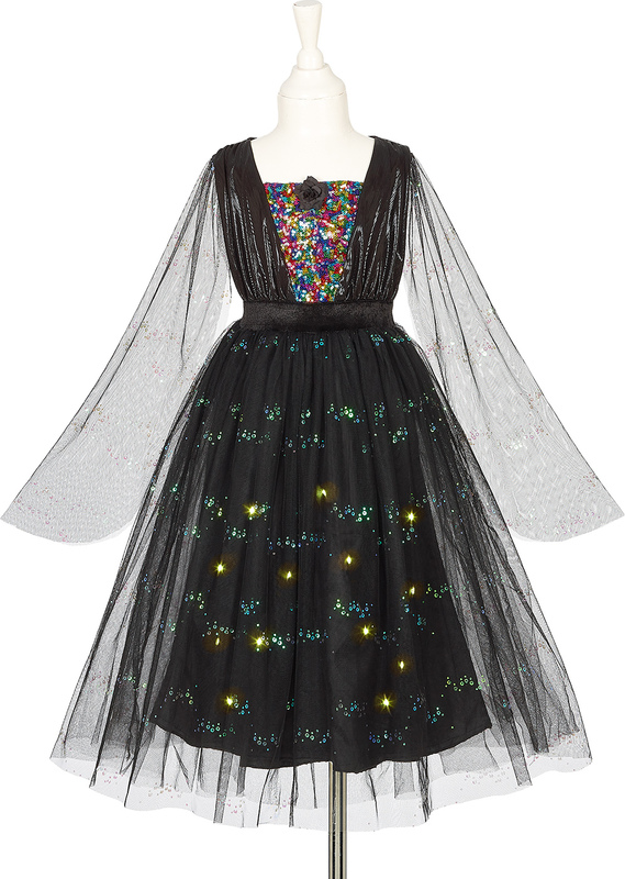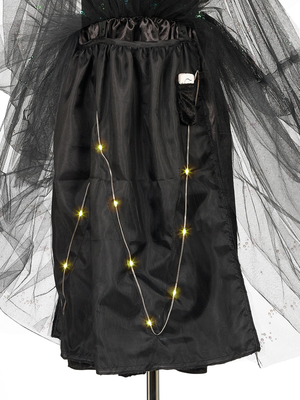 Kúzelný kostým pre každú malú čarodejnicu. Keď sa čarodejnica Agatha vznáša po nočnej oblohe, jej sukne svietia ako hviezdy. A tieto šaty to naozaj vedia – majú totiž v sukni schované malé svetielka, ktoré svietia v tme.
