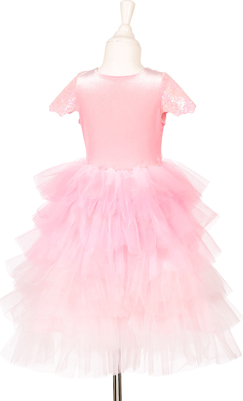 Tieto spoločenské šaty majú klasický strih s krátkymi rukávmi a pružným pásom. Vďaka tomu sa ľahko obliekajú cez hlavu – nie je potrebné žiadne zapínanie. Vrchnú časť šiat zdobia ružové flitre, ktoré sa krásne trblietajú na svetle. Sukňa je bohatá, z niekoľkých vrstiev jemného tylu s volánikmi, av páse ju zdobí ružový kvet. Šaty sú pohodlné a krásne sa nosia po celý deň.