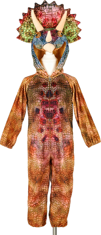 Kostým má kapucňu s dinosaurou hlavou, ktorá zaujme každého. Nechýbajú tri rohy, výrazné oči a farebný golier – presne ako u pravého Triceratopsa! Zadnú časť dopĺňa veľký plazí chvost. Celý overal je potlačený tak, aby pripomínal skutočnú dinosaurí kožu – má množstvo farieb a detailov.