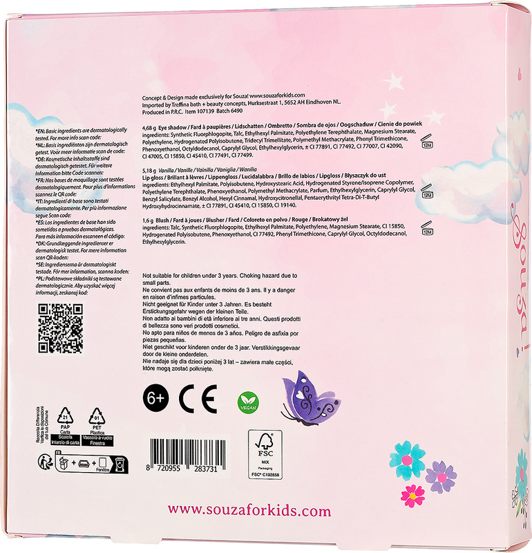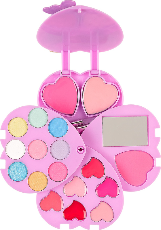 Očarujúca kozmetická sada v tvare srdca poteší každú malú parádnicu od 6 rokov. Po rozložení odhalí zrkadlo a pestrý výber detskej kozmetiky vhodné na bezpečné a hravé líčenie. Puzdro v tvare srdca sa rozkladá do strán a je dekorované perlami, motýlikmi a kvetinou. Celá sada je balená v kartónovej krabičke s priehľadným okienkom, ideálny ako darček.