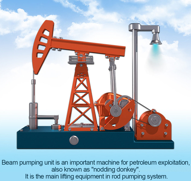 Elektromotor roztáča ojnicu a tým pohybuje vahadlom ako pri skutočnej ropnej pumpe.
