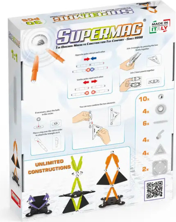 Supermag Glow je magnetická stavebnica, ktorá poteší všetky zvedavé deti od 5 rokov. Obsahuje magnetické tyčinky, oceľové guličky a plastové komponenty, z ktorých sa dajú vytvárať nekonečné konštrukcie – jediným limitom je fantázia.