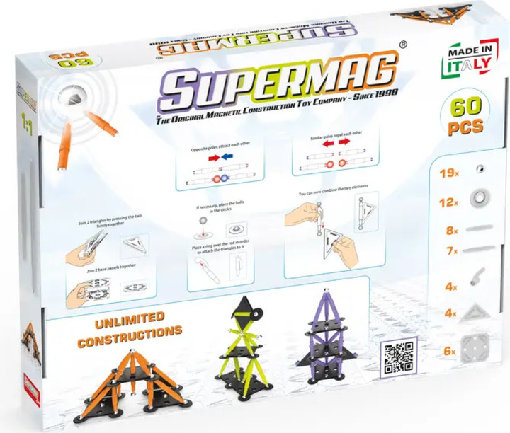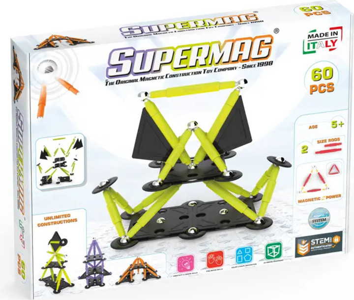 Supermag Technicolor je magnetická stavebnica so 60 dielmi, vhodná pre deti od 5 rokov. Obsahuje magnetické tyčinky, oceľové guličky a plastové komponenty, z ktorých možno vytvárať nekonečné množstvo stavieb – jediným limitom je fantázia.