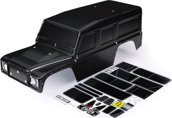 Náhradný diel pre RC modely áut Traxxas na podvozku TRX4: karoséria Land Rover Defender čierna s obtlačkami. Pre rázvor náprav 324mm.