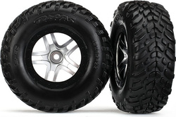 Kompletné zadné kolesá pre 2WD, predné aj zadné kolesá pre 4WD RC autá Traxxas Slash. Disky Split-spoke strieborné s čiernymi ráfikmi, nalepené pneumatiky SCT.