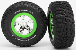 Kompletné predné kolesá pre RC autá. Chrómované disky so zelenými ráfikmi a nalepenými pneumatikami BFGoodrich® s vložkou.