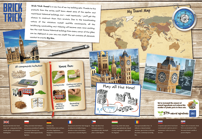 • Vďaka produktom Brick Trick Travel spoznáte niektoré z obľúbených a obľúbených pamiatok a hlavne - budete si ich môcť postaviť od základov.