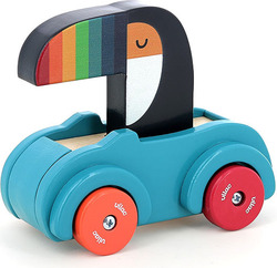 Drevené autíčko v modrej farbe s farebnými kolesami, v ktorom sedí tukan s farebným zobákom. Pod tukanom je zabudovaný klaksón, preto keď dieťatko zatlačí na hlavu tukana, ozve sa zatrúbenie.
