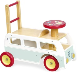Drevené odrážadlo a vozíček v jednom je vybavený systémom, ktorý zabraňuje preklopeniu. Je veľmi stabilný. Volantom sa otáča kolieska v smere jazdy. Praktický úložný priestor na hračky.