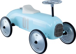 Vintage napodobenina pretekárskeho auta je plne kovová a má svetlo modrú farbu. Volant ovláda zatáčanie predných kolies. Sedadlo je vyrobené z plastu. Kolesá odrážadlá sú pogumované a zaručujú tak tichý chod aj na pevnom povrchu. Výška sedadla je 28 cm. Po vybalení nutné zložiť. Vhodné od 18 mesiacov.