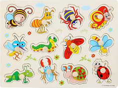 Drevená vkladačka obsahuje celkom 12 figúrok hmyzu, s ktorými sa dá ľahko manipulovať pomocou drevených úchytov.