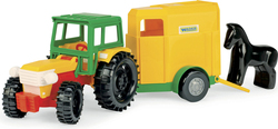 Sada obsahuje: traktor, otvárací príves na prepravu zvieratiek a figúrku koňa realistické vozidlo s celkovou dĺžkou 38,5 cm (traktor s prívesom)