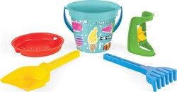Sada obsahuje 5 prvkov: lopatku, hrable, mlynček, sitko a vedierko (2 l) so zaujímavou grafikou vyrobené metódou IM.