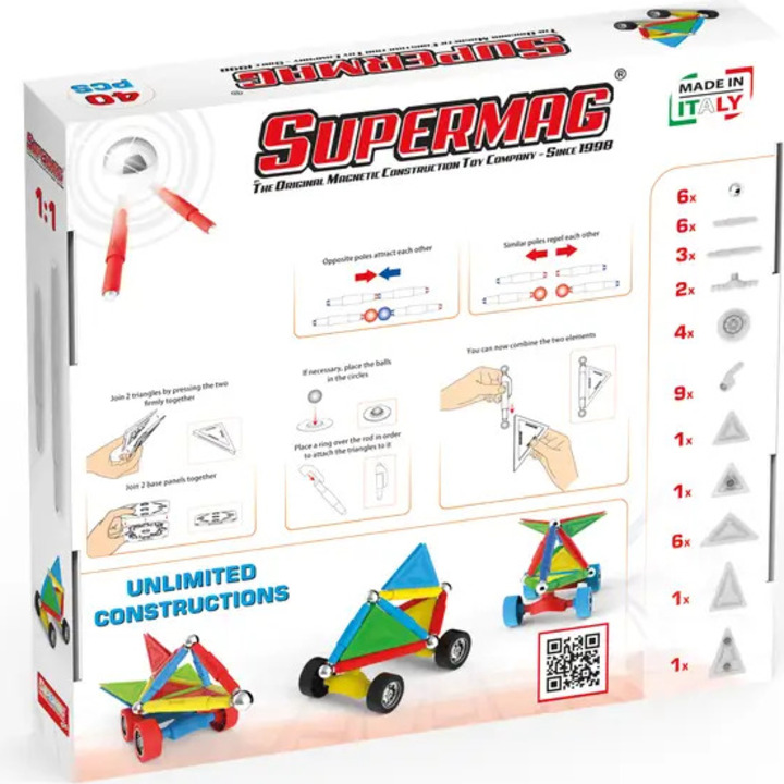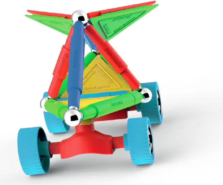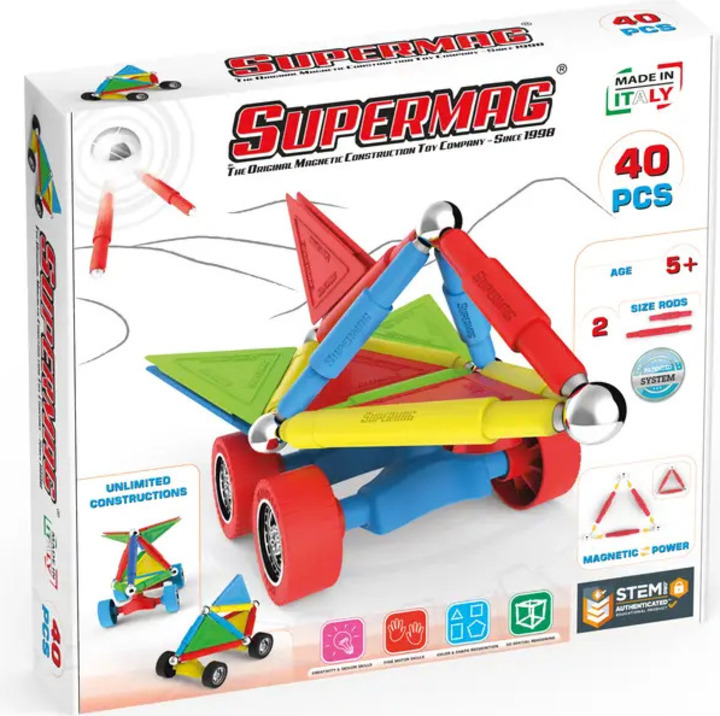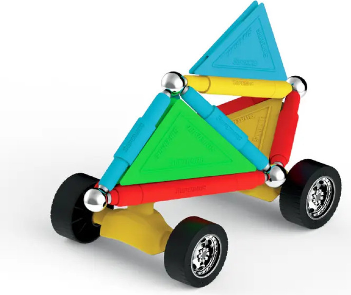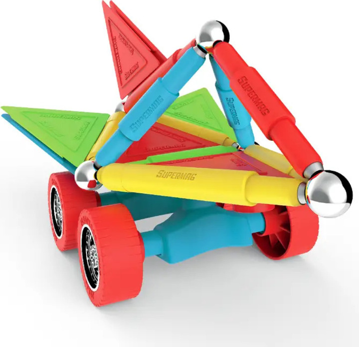 Supermag Wheels je magnetická stavebnica so 40 dielmi, vhodná pre deti od 5 rokov. Obsahuje magnetické tyčinky, oceľové guličky a plastové komponenty, z ktorých možno vytvárať nespočetné množstvo konštrukcií – jediným limitom je fantázia.
