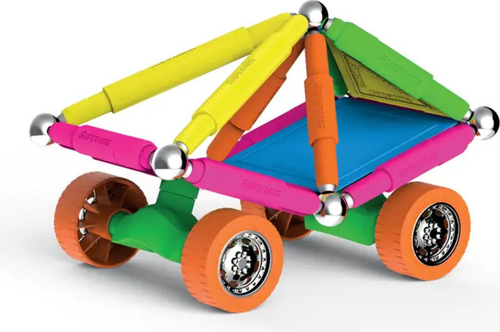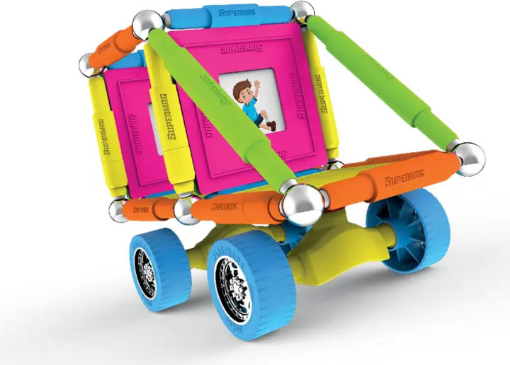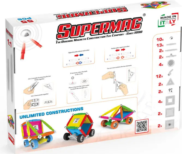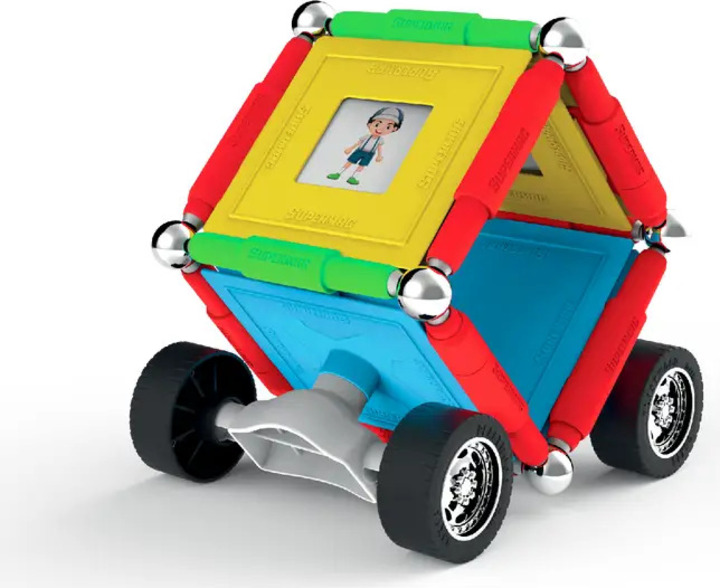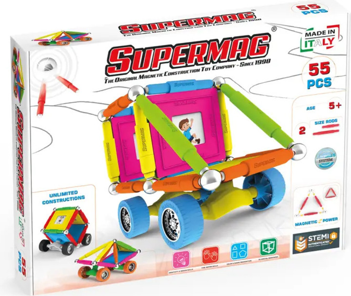 Supermag Wheels je magnetická stavebnica s 55 dielmi, vhodná pre deti od 5 rokov. Obsahuje magnetické tyčinky, oceľové guličky a plastové komponenty, z ktorých možno vytvárať nespočetné množstvo konštrukcií – jediným limitom je fantázia.