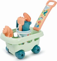 Ručný záhradný vozík s príslušenstvom. . Vozík sa ľahko ovláda vďaka praktickému tiahlu. S vedierkom na piesok, sitom, kanvičkou, lopatkou, hrabličkami a formičkou na piesok.