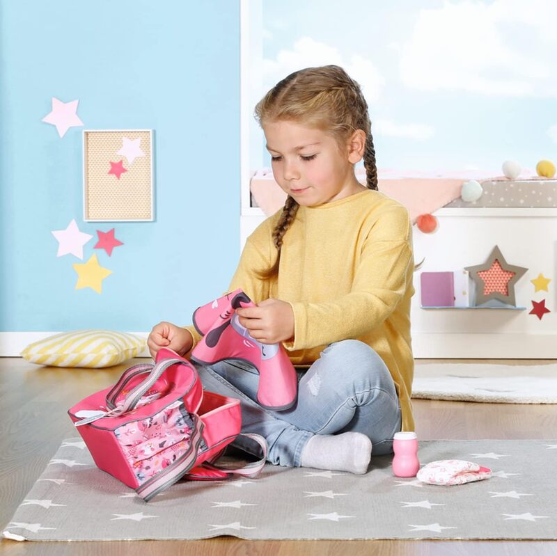 BABY born sa teší na každý výlet rovnako ako jej zvierací kamaráti na prebaľovacej taške. Jejda, zo samého tešenia už je niečo v nohaviciach. Našťastie môžeme mať stále so sebou praktickú prebaľovaciu tašku. Obsahuje totiž všetko, čo dieťatko potrebuje: prebaľovaciu podložku, náhradnú plienku a dózu s púdrom. Je tu tiež dosť miesta aj na ďalšie nevyhnutnosti, ktoré sa na výlete môžu hodiť. Napríklad cestovný poriadok autobusov a poklady nazbierané cestou. Tašku je možné nosiť pohodlne cez rameno alebo v ruke. Na ramenných popruhoch visia roztomilé visačky, s ktorými sa bábika BABY born môže pri prebaľovaní hrať.